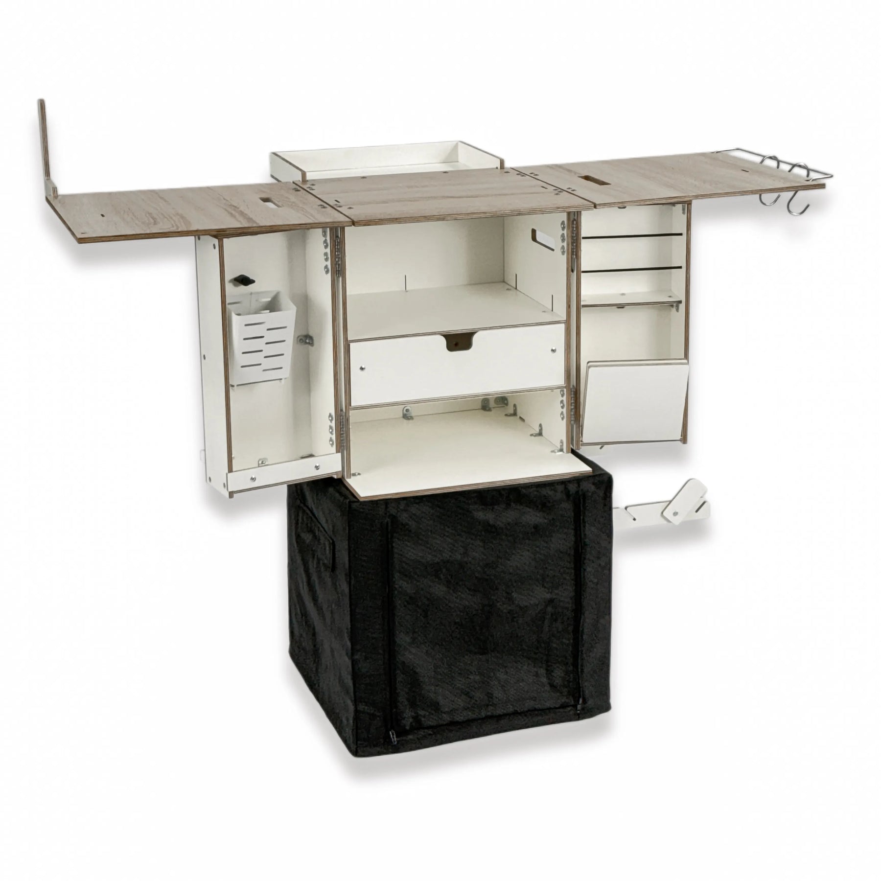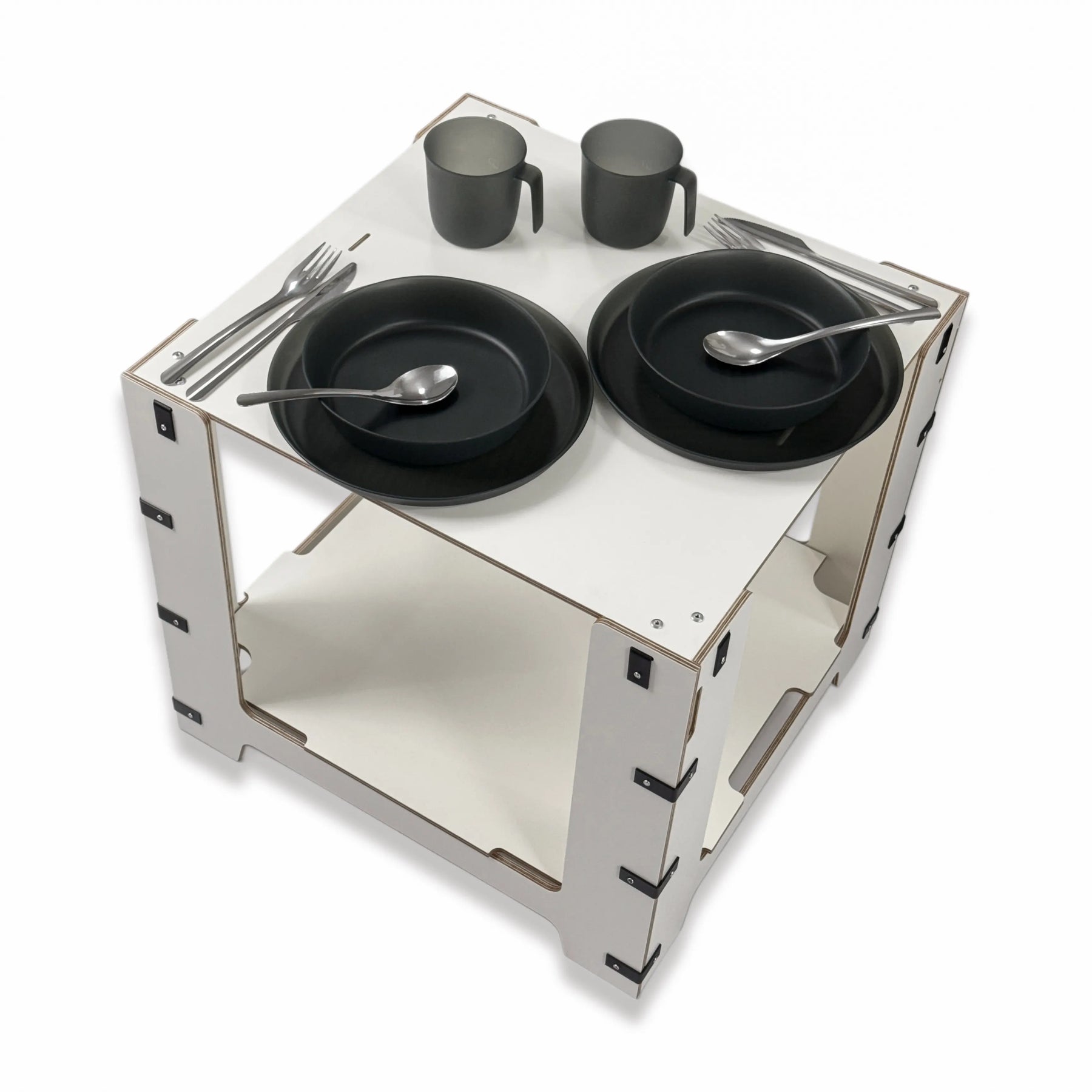 A modular camping kitchen that folds into one compact box for transport.